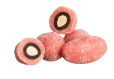 Puderzucker (Zucker, Antibackmittel: Maisstärke), MANDELN 25%, dunkle Schokolade 15% (Kakaomasse, Zucker, Kakaobutter, natürliches Vanillearoma, Emulgator: SOJAlecithin), geröstete MANDELN 7%, Zucker, Invertzuckersirup, Stabilisator: Sorbitole, Armagnac, Ingwer Vodka, Himbeeraroma, Emulgator: Glycerin, überzugsmittel: Gummi Arabicum, Säuerungsmittel: MILCHsäure, Farbstoff: Cochenille Karmin, Lutein. Kann Spuren von Milch, Erdnüssen, Schalenfrüchten und Gluten enthalten.